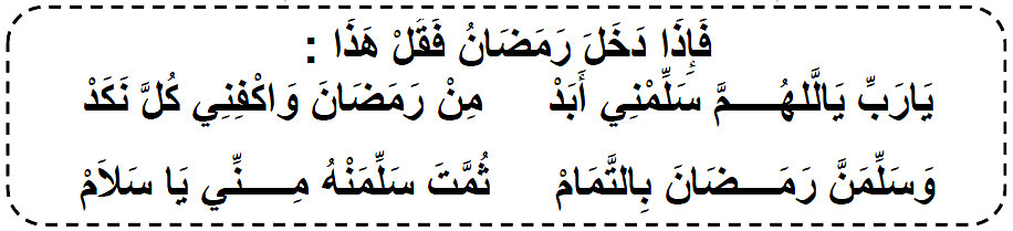Yâ Rabbi yâl lâhumma sallimnî abad Min ramadâna wakfinî kulla nakad Wa sallimanna ramadâna bit -tamâm thummata sallimanhu minnî yâ salâm